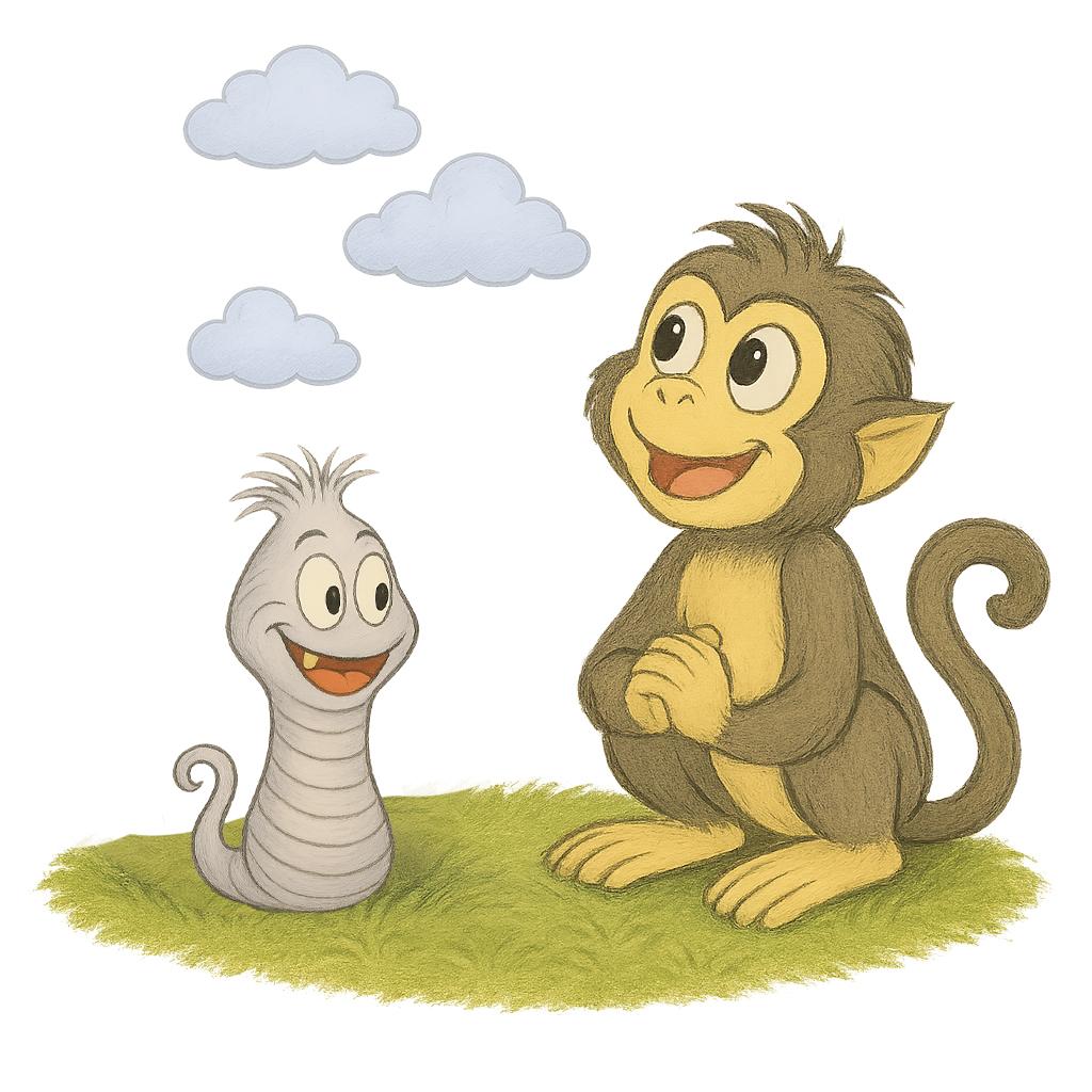 Lekkie starts to slide off the grass, full of renewed purpose. Zippy grins, then with a flick of his tail, he zips back up to his vine, the cheerful, energetic monkey once more, but with a new, deeper respect for his small, boastful, and incredibly brave friend.