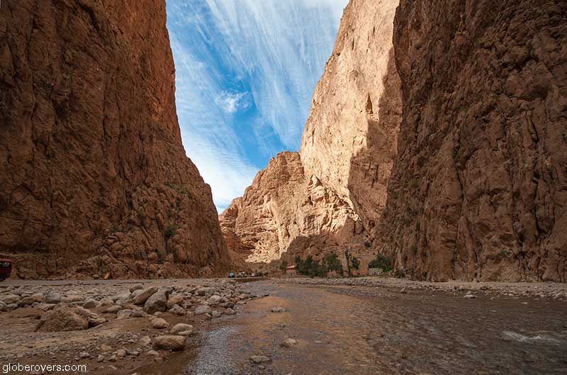 Gorges du Todgha has spectacularly carved out cliff-sided canyons which in some places are as little as 10 m wide with sheer, smooth rock walls over 160 m high on each side.